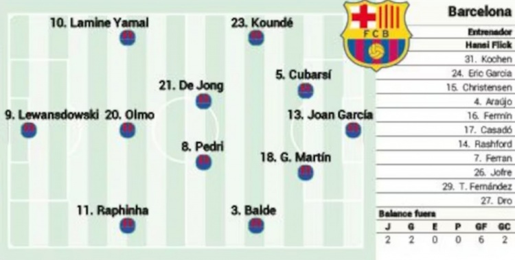 8月31日讯 北京时间周一凌晨的西甲第3轮比赛,巴萨将前往客场挑战巴列卡诺。《阿斯报》对本场比赛首发阵容进行了预测,库巴西和杰拉德-马丁搭档中卫,莱万、亚马尔和拉菲尼亚组成进攻三叉戟,加维缺阵。