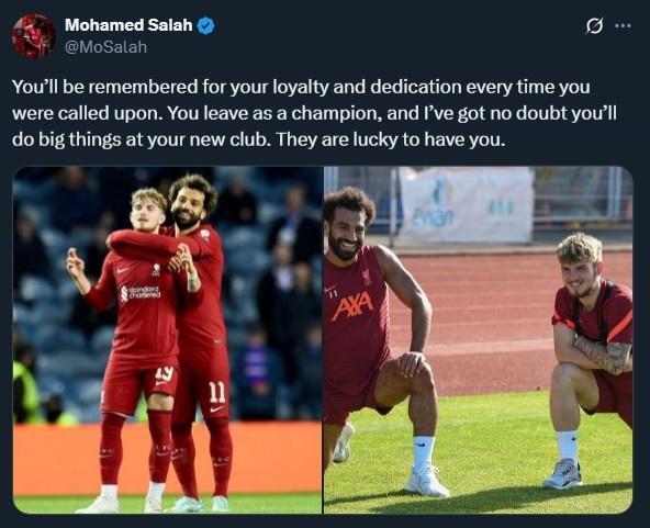 萨拉赫写道:“你的忠诚和每一次上场所表现出来的投入将会被铭记,你作为一个冠军离开,我毫不怀疑你会在新东家成就伟大事业,拥有你是他们的幸运。”